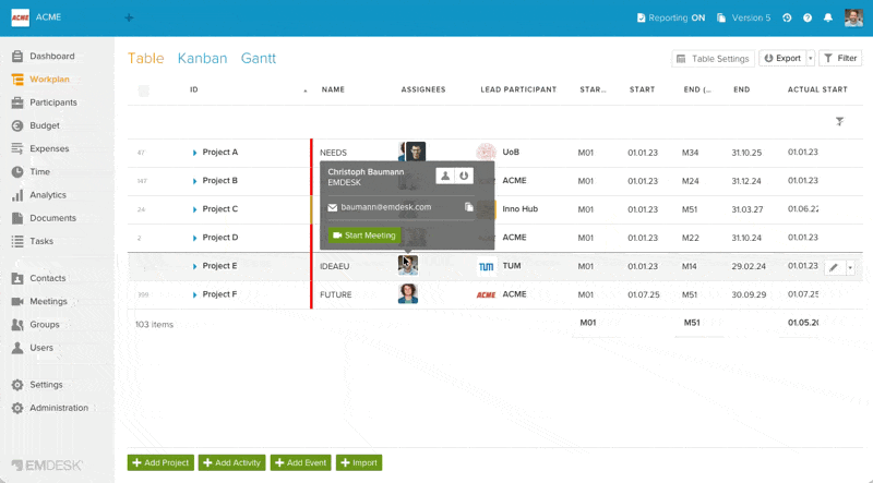 The Table View is one of three view modes (Table, Kanban, Gantt) and provides a spreadsheet-like display of your workspace with its hierarchical lists of activities, deliverables, milestones, budget, expenses, participants, and all other properties accessible in the Workplan, Participants, Budget, and Expenses sections. This view starts as an empty table and populates as you add data to your workspace.