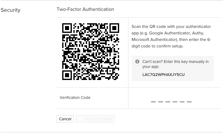 Enter the 6-digit code from your authenticator app into the verification field and click Verify & Enable.
