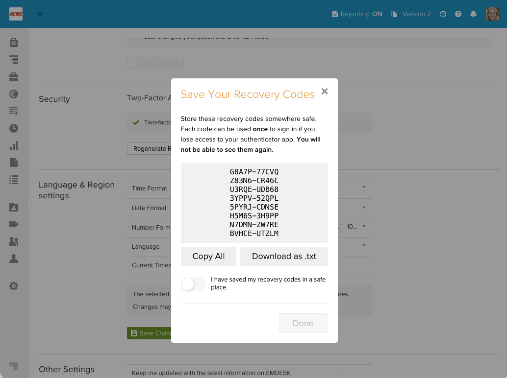 After successful verification, EMDESK displays your recovery codes. These are single-use backup codes you can use to sign in if you lose access to your authenticator app.