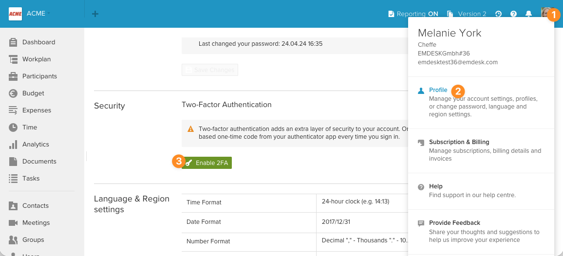 Two-factor authentication (2FA) adds an extra layer of security to your EMDESK account. When enabled, you need both your password and a time-based one-time code from an authenticator app to sign in. This helps protect your account even if your password is compromised.